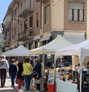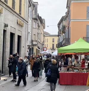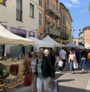 tradizionale mercatino con bancarelle di antichità, artigianato, collezionismo, modernariato, ingegno creativo, prodotti tipici alimentari e prodotti biologici non alimentari naturali in Via Emilia, centro storico di Voghera